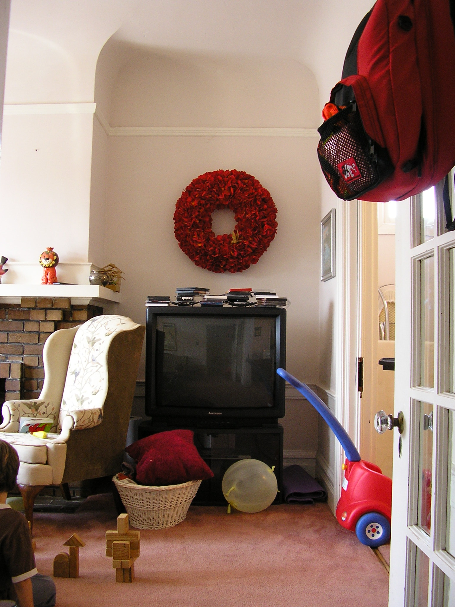 Corner of living room with TV, toys, wreath, & pink walls: