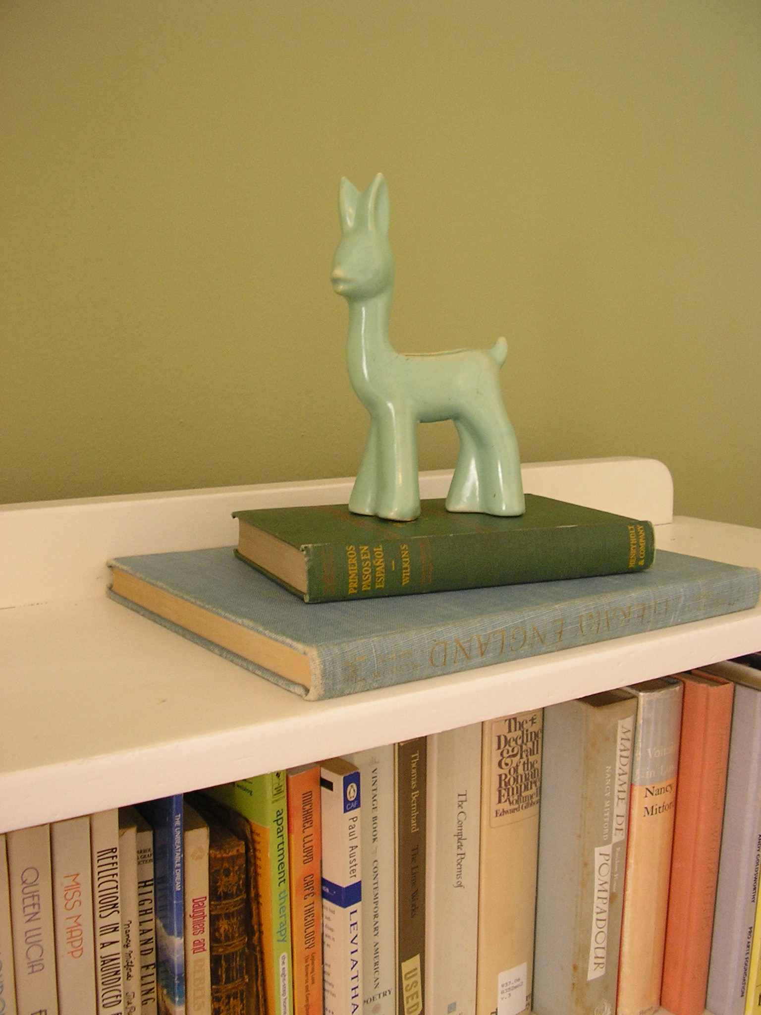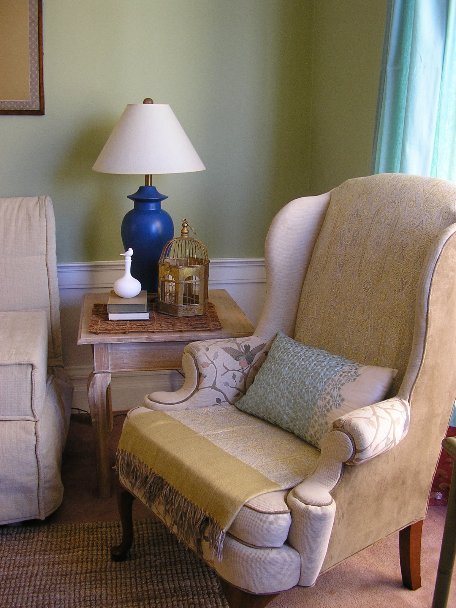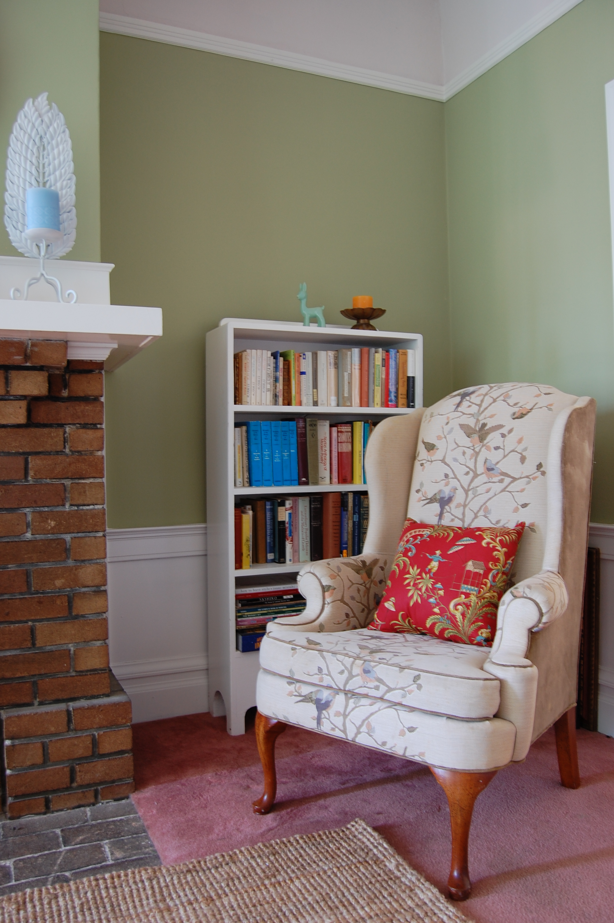 Same corner with bookcase and a reading wingback: