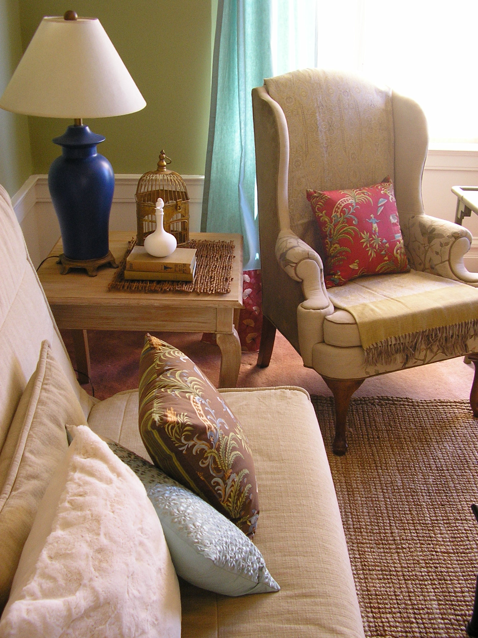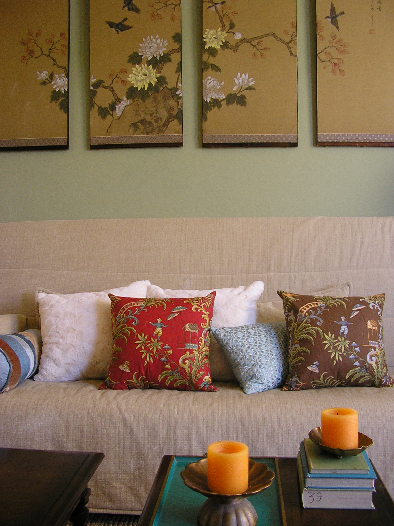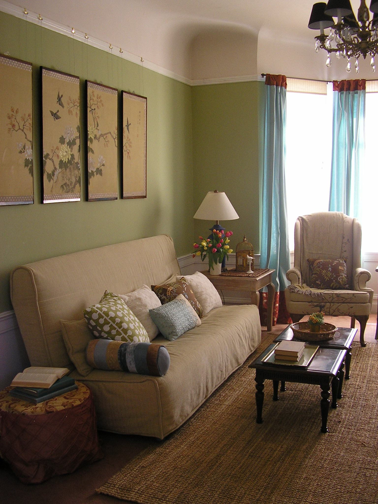 Asian details. I seperated the panels of an antique silk screen ($20) for more interest, the green wall frames each panel: