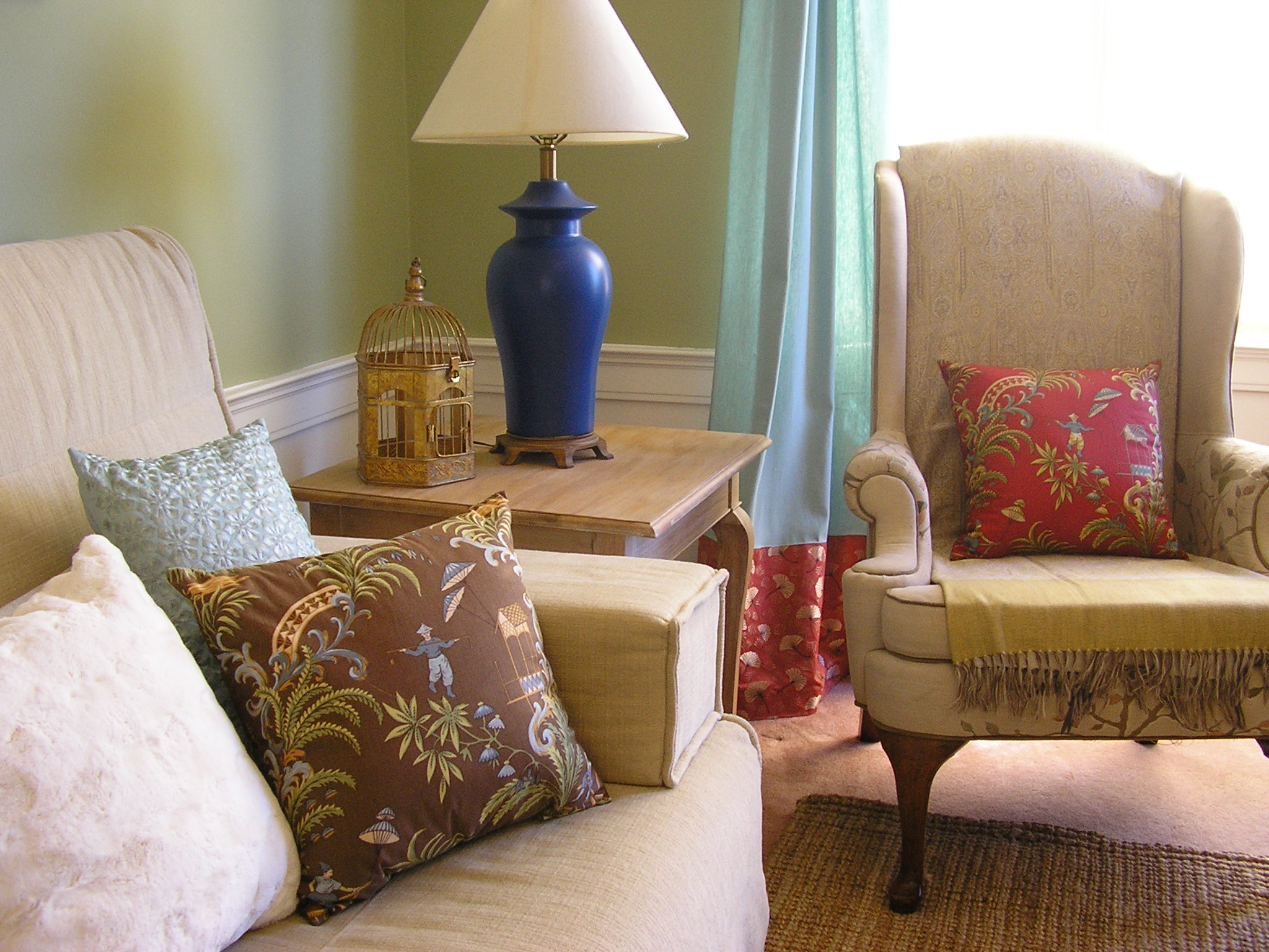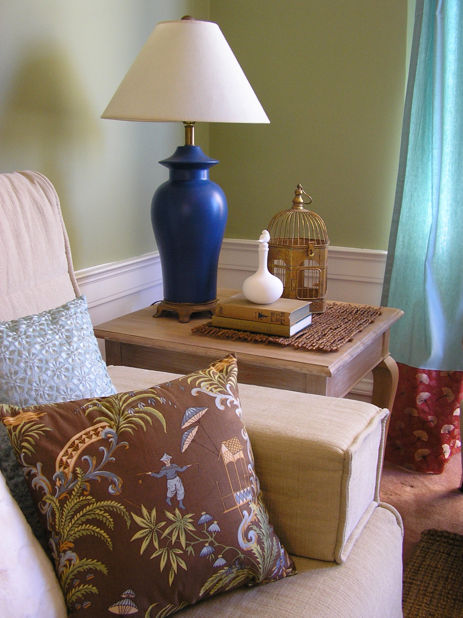 Took readymade curtains ($25/pair) and added a custom border to the hem; painted a $5 ginger jar ceramic lamp a bold peacock blue, shows off the lines against the green walls:
