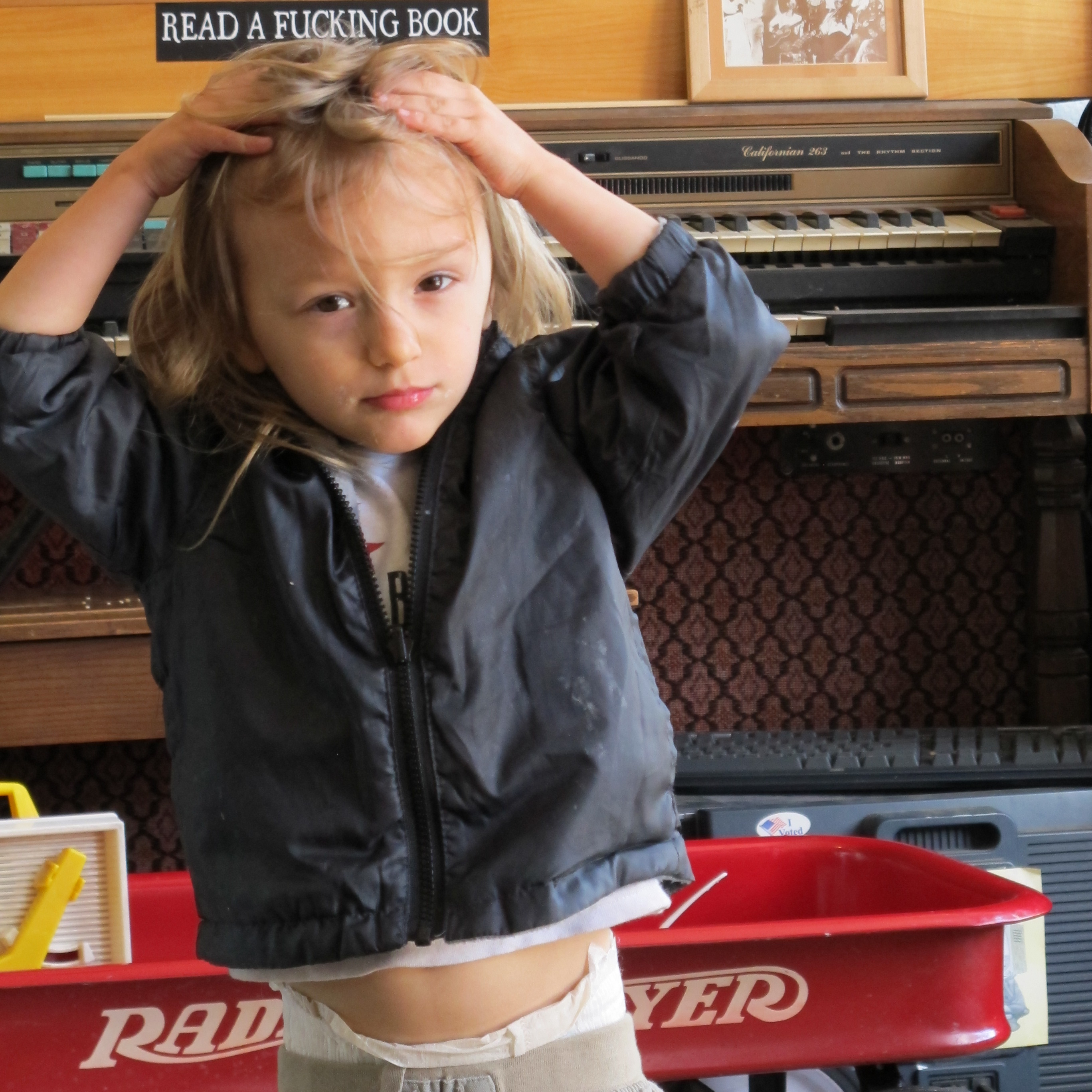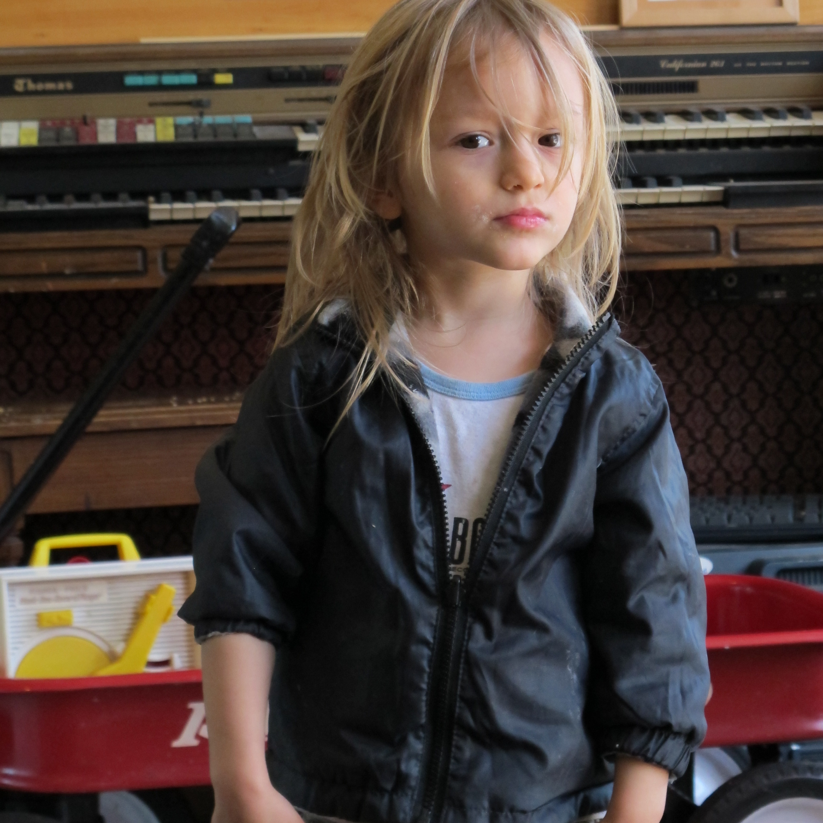 It's a homey little shop complete with loveseat and so many piles around the edges that I had to look hard to find where I had put down my coat when we were leaving. Like our home. One of the owners, Adam, was there with his musically sophisticated son Henry (part-time DJ, part-time toy tractor operator). Very sweet peeps. Henry likes to hang out in the glass display case that he made into a little fort. This shop has great prices and killer taste. We love it!
