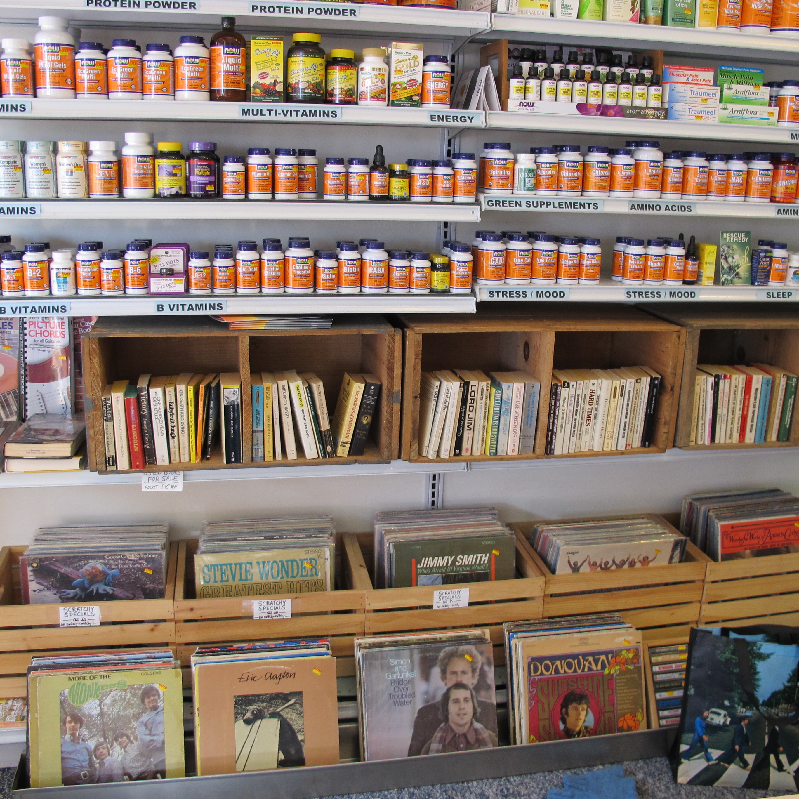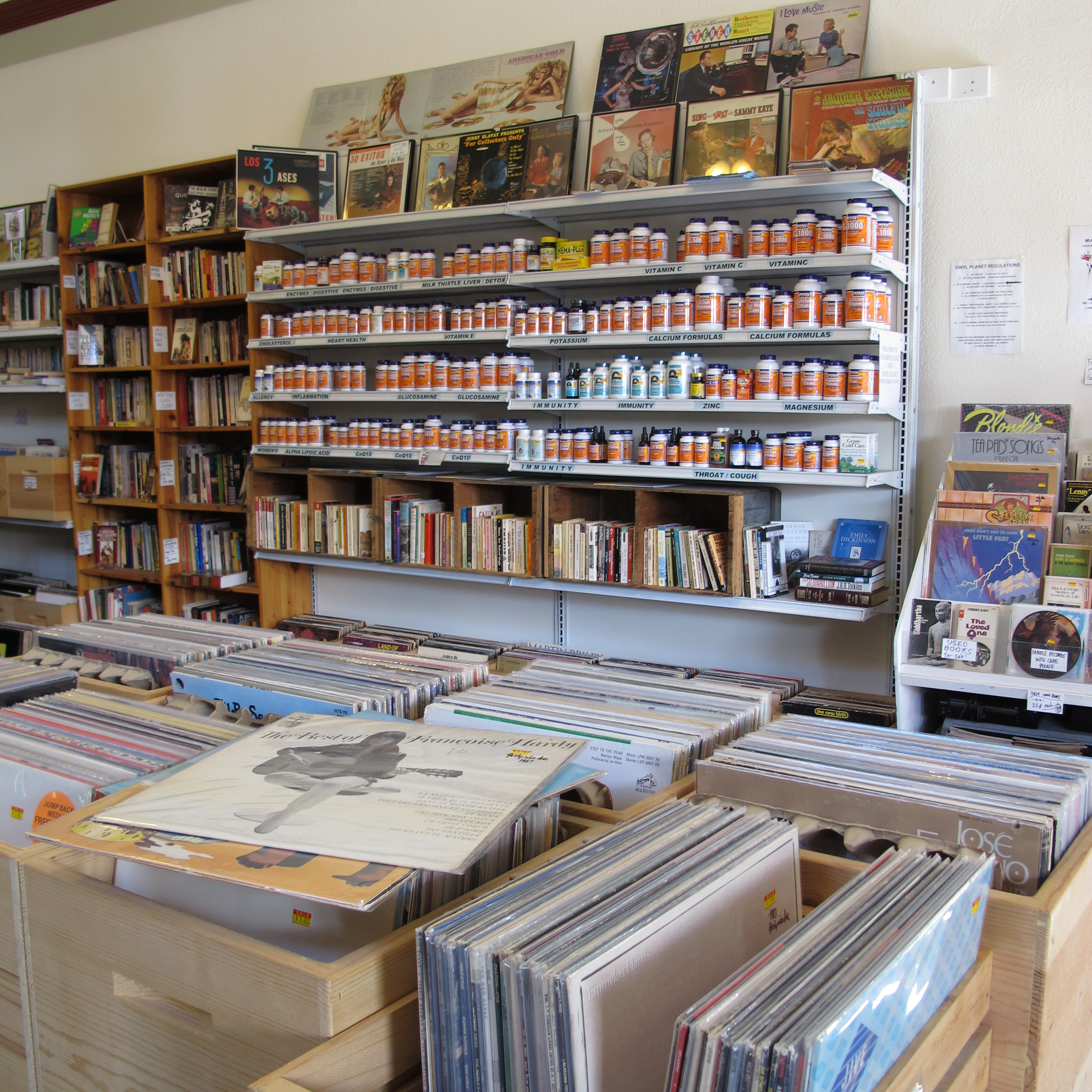 From there we drove further south to Petaluma where we were tickled to find Vitamin Planet – slash – Vinyl Planet. Yes, they sell vitamins and vinyl. Music and magnesium! Also a small but eclectic offering of used books, some real gems. I picked up a 1976 paperback called Country Lesbians: The Story of the Womanshare Collective (in Grants Pass, Oregon). It's fascinating.