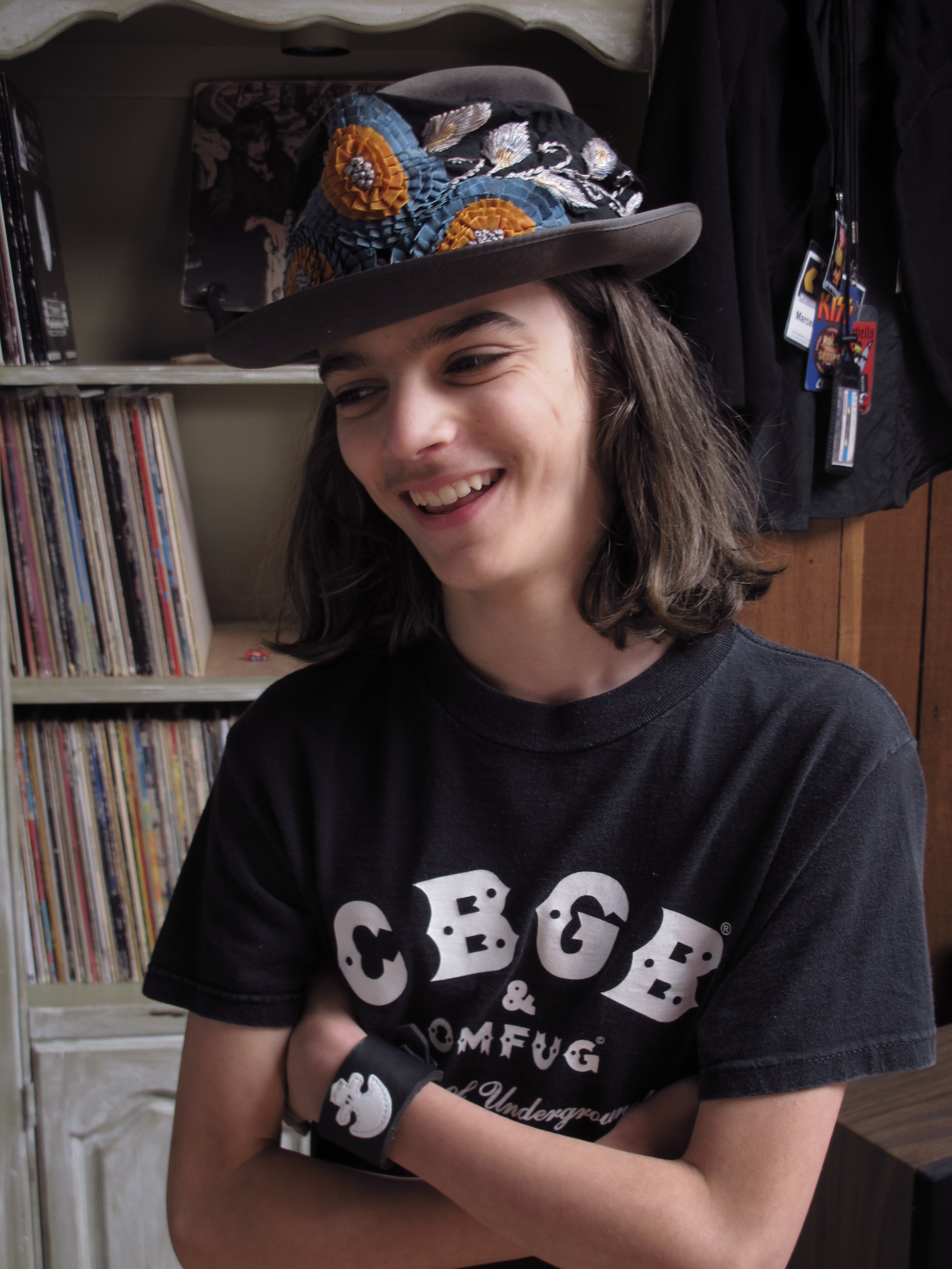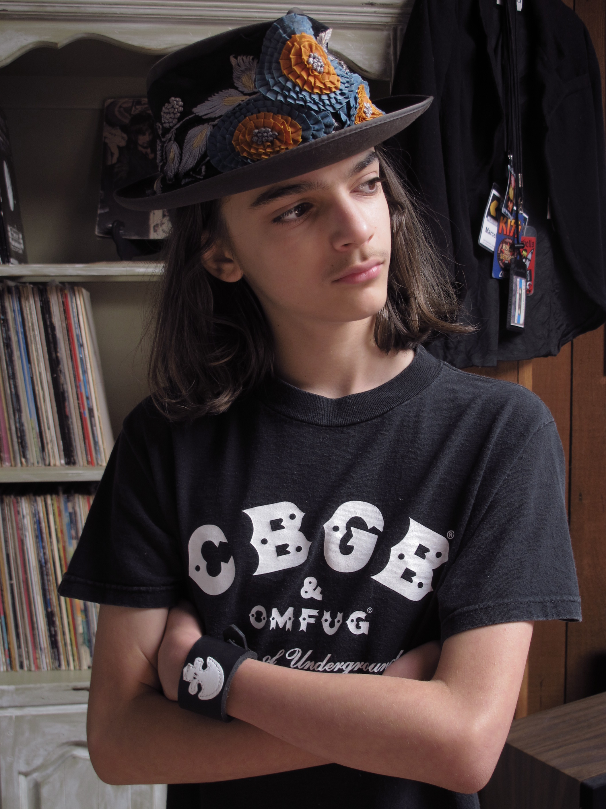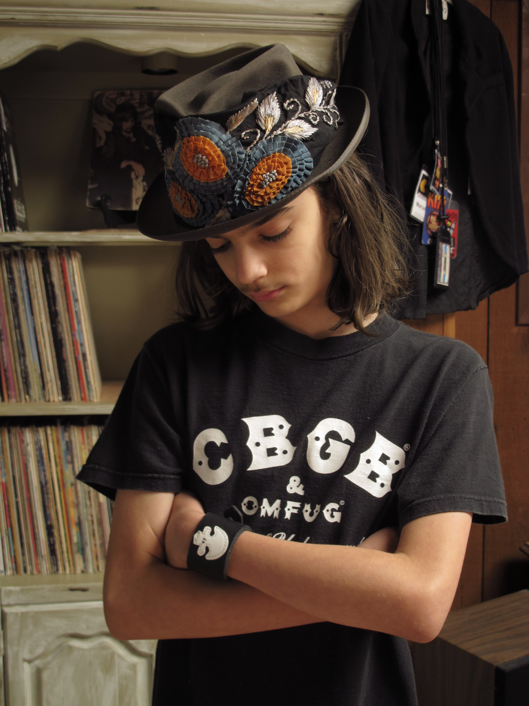 He's wearing a vintage CBGB's t-shirt and a 1940s fedora that I've had for about 30 years. It's embellished with a black silk fragment from a 1920s gown. The pattern is leaves embroidered with silver and blue silk thread and flowers formed with teal and orange grosgrain ribbon. The skull wrist strap was custom made by a friend (details by request).